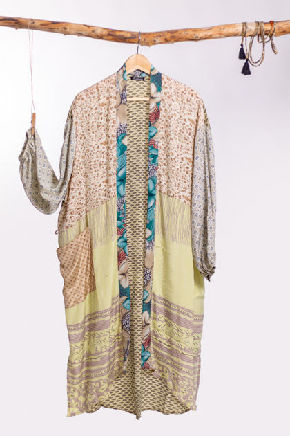 Jeder einzelne wurde aus sechs verschiedenen, liebevoll ausgewählten Vintage-Saris gefertigt und macht dein Outfit zu einem echten Hingucker.