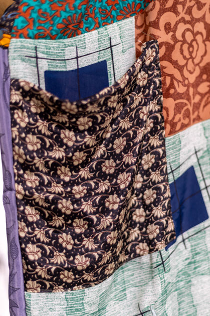 Jeder einzelne wurde aus sechs verschiedenen, liebevoll ausgewählten Vintage-Saris gefertigt und macht dein Outfit zu einem echten Hingucker.